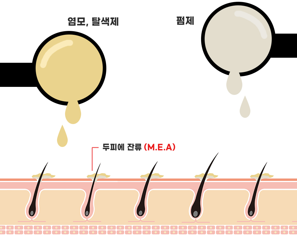 주로 사용되는 알칼리제로는 암모니아, 모노에탄올아민 등이 있는데 모노에탄올아민(M.E.A)은 휘발성이 없어 모발 및 두피의 잔류성이 높아 손상을 야기 시킬 수 있습니다.